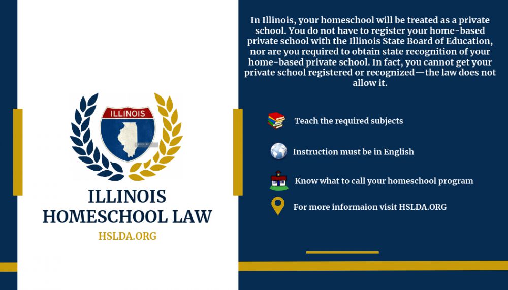 For more information on the homeschooling laws and state requirements in Illinois we recommend you visit HSLDA.org site, Home School Legal Defense Association.